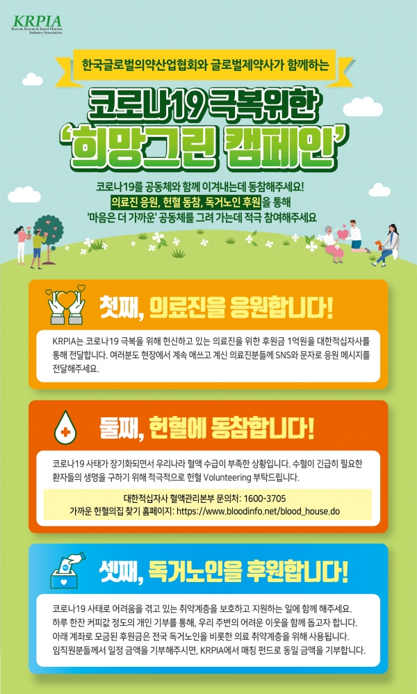 한국글로벌의약산업협회(KRPIA, 회장 아비 벤쇼산)는 코로나바이러스감염증-19(코로나19) 극복을 공동체와 함께 해 나가자는 취지로 전회원사 임직원들이 참여하는 ‘희망그린 캠페인’을 진행한다고 발표했다.