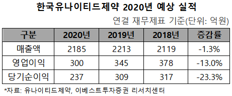 최석원 애널리스트는 19일 이베스트투자증권 보고서를 통해 이 같이 밝혔다. 분석에 따르면, 유나이티드의 2020년도 예상 매출은 전년 대비 1.3% 감소한 2185억원, 영업이익과 순이익은 13%·23.3% 감소한 300억·237억원이다. 반면, 유나이티드제약은 올해 매출 목표를 전년 대비 4.5% 성장한 2300억원으로 설정한 바 있다.