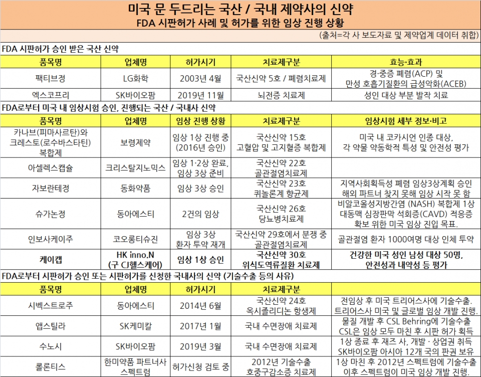 미국 진출 사례 무엇 있나=국내 제약사 약물의 FDA 시판승인은 자력으로 하거나 임상개발 중 글로벌 제약사에 기술수출해 그 곳이 진행하는 경우로 나뉜다.