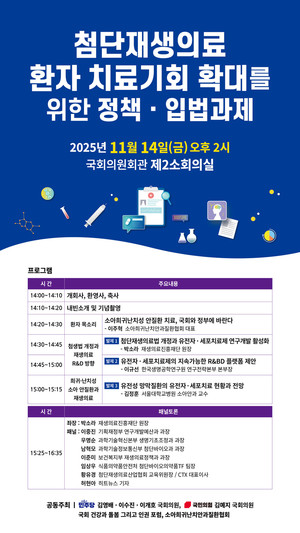 첨단재생의료 치료 기회를 기다리는 희귀난치질환 환자들의 실상을 듣고 정책당국과 국회, 산업계가 실질적인 해법을 모색하는 자리가 마련된다.국회 더불어민주당 외교통일위원회 김영배 의원, 보건복지위원회 간사인 더불어민주당 이수진 간사와 이개호 의원, 국민의힘 김예지 의원, 소아희귀난치안과질환협회는 14일 오후 2시 국회의원회관 제2소회의실에서 '첨단재생의료 치료 기회 확대를 위한 입법·정책과제'를 집중 점검한다. 국회 연구단체인 '국회 건강과 돌봄 그리고 인권 포럼'도 함께했다.이번 토론회는 첨단재생의료 기초연구부터 실용화에 이르기까지