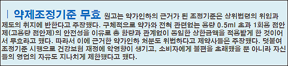 먼저 재판부는 복지부와 심사평가원이 개최한 안과전문의 자문회의 결과와 식약처 허가사항 등을 감안할 때 일회용 점안제 기준규격 설정은 정당하다고 봤다. 가령 안과전문의들은 점안제 1방울이 40ul이라고 할 때 환자가 잘못 넣어 흘러내리는 양을 감안해도 양안에 5방울씩 총 10방울에 해당하는 0.4ml로 충분하므로 0.3~0.5ml를 일회용 점안제의 적정용량 기준규격으로 판단했다.