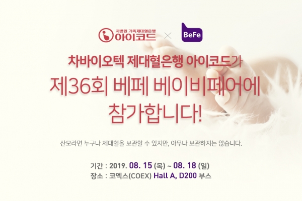 차바이오텍은 "제대혈은행 아이코드가 오는 15일부터 18일까지 4일간 서울 삼성동 코엑스에서 열리는 제36회 베페 베이비페어(A홀 D200 부스)에 참가한다"고 9일 밝혔다.