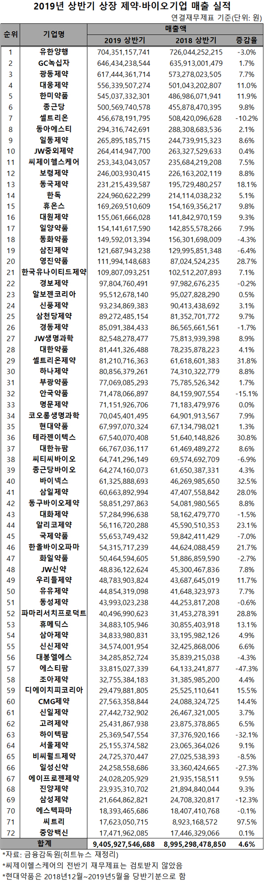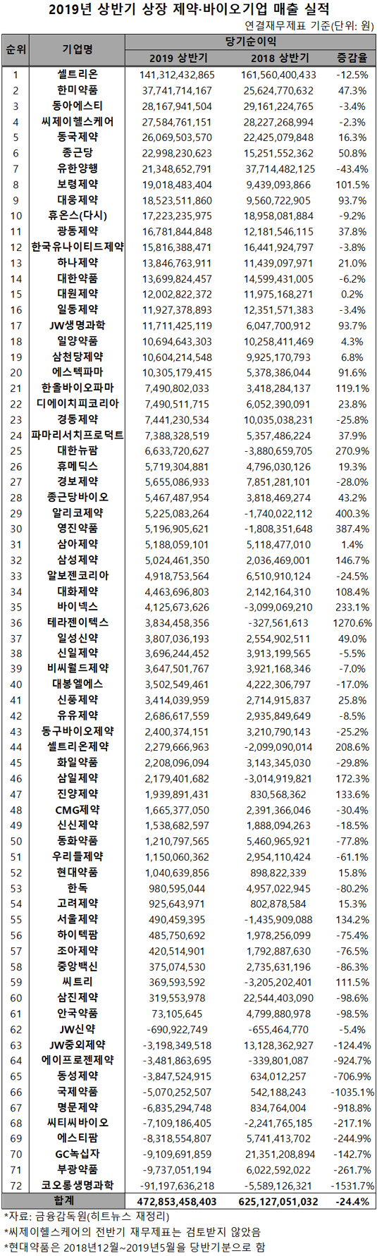 히트뉴스는 금융감독원에 공시된 72개 상장 제약바이오기업의 2019년 반기보고서를 연결재무제표 기준으로 분석했다. 15일 분석 결과, 전반적으로 실적이 좋지 않은 편이었다.
