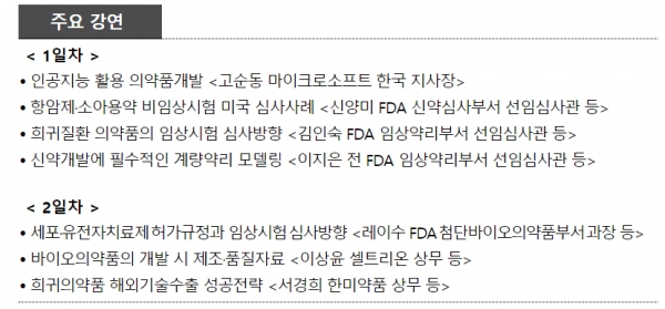 특히 최근 개발이 활발한 희귀·난치성 질환 치료제와 바이오의약품을 중심으로 미국 FDA 전·현직 허가심사자를 비롯해 국내 석학과 제약 전문가가 참여해 의견을 나눌 계획이다. 또한 올해는 20명의 연자(미 FDA 연자 8명)를 초청해 7개 세션으로 진행할 예정이다.