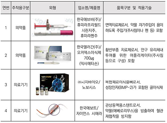 2013년 바이오의약품·의료기기 간 협의의뢰 절차가 제정·운영되면서 연 20개 이상의 제품이 시장에 출시되고 있다. 자가 투여 및 국소 부위로의 전달 개선을 위해 프리필드시린지(사전충전형 주사기)·주사침을 포함하는 주입기나 어플리케이터를 동반하는 제품이 대표적인데, 한국애브비의 면역치료제 '휴미라프리필드·시린지주·휴미라펜주'가 이에 해당한다.