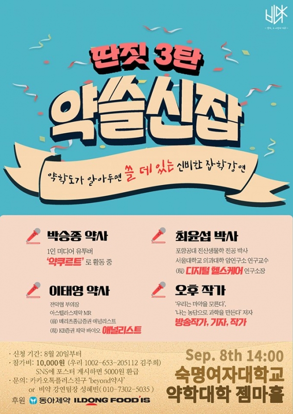지난 20일 비약은 내달 8일 오후 2시부터 저녁 6시까지 숙명여대 제2창학캠퍼스 약학대학 젬마홀에서 약사와 약대생 대상 강의 '딴짓:약쓸신잡'을 진행한다고 했다.