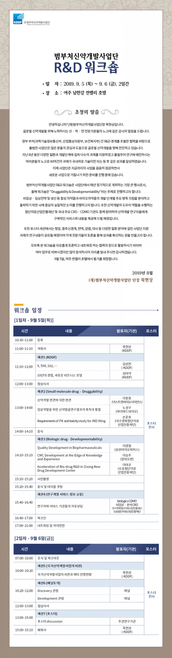 범부처신약개발사업단(단장 묵현상)이 9월 5일부터 6일까지 여주 썬밸리 호텔에서 ‘2019 R&D 워크숍’을 개최한다. R&D 워크숍은 국내 신약개발 종사자 200명을 대상으로 글로벌 신약개발 성공을 위해 사업단에서 매년 정기적으로 개최하는 가장 큰 규모의 워크숍이다.
