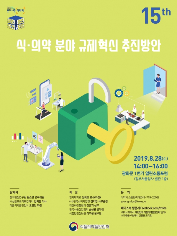 식품의약품안전처(처장 이의경)는 오는 28일 소비자단체·업계·학계와 함께 '식·의약 분야 규제혁신 추진방안'을 주제로 '제15회 식품·의약품 안전 열린포럼'을 광화문1번가 열린소통포럼실에서 개최한다고 27일 밝혔다.