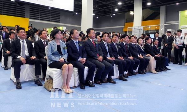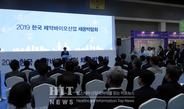 '2019 한국 제약바이오산업 채용박람회'가 3일 오전 9시30분 서울 양재 aT센터에서 원희목 한국제약바이오협회장, 김초일 한국보건산업진흥원 기획이사, 허선 한국보건복지인력개발원장, 김강립 보건복지부 차관, 임인택 보건복지부 보건산업정책국장, 김영옥 식품의약품안전처 국장, 김대업 대한약사회장, 이정희 한국제약바이오협회 이사장, 이영호 대구경북첨단의료산업진흥재단 이사장, 이경국 한국의료기기산업협회장, 지동현 국가임상시험지원재단 원장, 김세연 국회 보건복지위원회 위원장, 오제세 국회 보건복지위원, 주요 제약 대표이사(한미약품 권세창 사장) 등 내빈들이 대거 참석한 가운데 개막했다.