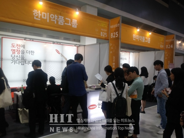 특히, 한미약품·종근당은 이른 오전부터 지원자 줄이 이어져 인기를 실감케 했다. 이 외 메디톡스, 동아쏘시오그룹, 대원제약, 휴온스, 한국유나이티드제약, 한국콜마, 유한양행 자회사 유한필리아, GC녹십자그룹, 일동제약, 보령제약, 안국약품 등에서 운영하는 상담부스도 성황을 이뤘다.