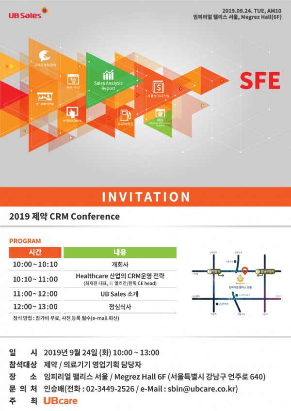 서울 강남구 소재 임피리얼 팰리스 호텔에서 진행될 이날 행사에서, 유비케어는 헬스케어 산업에서의 CRM(고객 관계 관리) 활용과 트렌드를 살펴보고 자사가 개발한 SFE(영업 효율화) 솔루션 'UB Sales'(유비세일즈)도 소개할 예정이다.