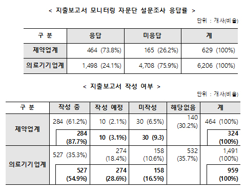 복지부 관계자는 "의료기기는 영세업체가 많고 지출보고서 관련 규정 규율대상에 해당하는 지 명확하지 않아 모수를 특정하기 어렵다"면서 "이 때문에 이번 설문결과만 놓고 (의료기기업체의) 응답률이 낮다고 단정하는 건 한계가 있다"고 했다.
