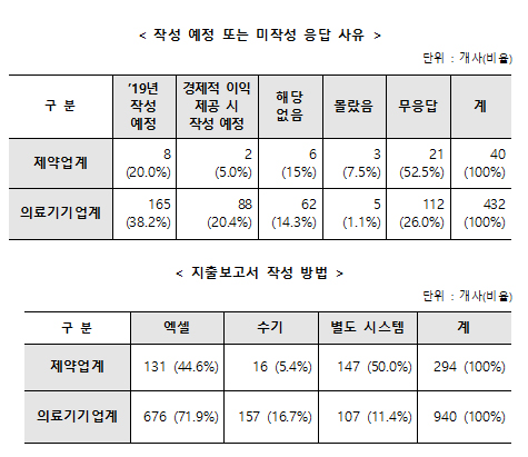 작성방법은 제약사의 경우 별도 시스템(147곳, 50%), 엑셀(131곳, 44.6%), 수기(16곳, 5.4%) 순이었고, 의료기기는 엑셀(676곳, 71.9%), 수기(157곳, 16.7%), 별도 시스템(107곳, 11.4%) 순으로 많았다.