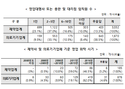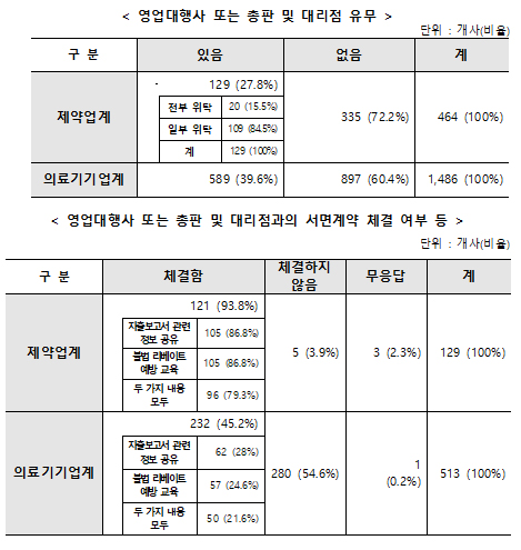 영업대행사·총판 등 현황=응답한 제약사의 27.8%(129곳), 의료기기업체의 39.6%(589곳)가 영업대행사나 총판·대리점에 영업을 위탁한다고 했다.