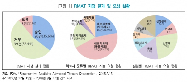 입법이후 실적은 어떨까. RMAT 지정신청건수는 2017년 31건, 2018년 47건, 2019년 6월 30일 기준 30건으로 매년 증가세다. RMAT 지정 결과는 승인 약 35.6%, 거부 약 53.4%, 보류 약 11%를 나타났다. 치료제 종류별로는 동종세포치료제가 약 45.2%로 가장 많았고, 자가세포치료제, 유전자치료제가 뒤를 이었다. 질환별로는 신경계, 종양, 심혈관계 순으로 나타나 다빈도 질환이 아닌 항암제를 비롯한 특수질환 치료제가 많은 것을 확인할 수 있다.
