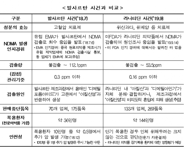 라니티틴 후속조치=식약처는 라니티딘 제제 유통 중단에 이어 약국 등이 보유한 판매중지 대상 의약품 회수도 조속히 완료한다는 계획이다. 또 분석화학 등 전문가가 참여하는 조사위원회를 지난달 구성, 해외 규제기관과 협력해 라니티딘 중 NDMA 생성원인 조사에 착수했다.