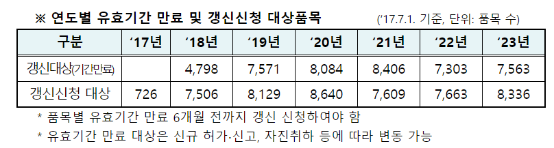 2013년 이후 품목은 허가·신고 시 5년, 2013년 이전 품목은 분류번호 별로 2018년 9월 30일부터 2023년 6월 30일 중 만료일이 부여됐다.