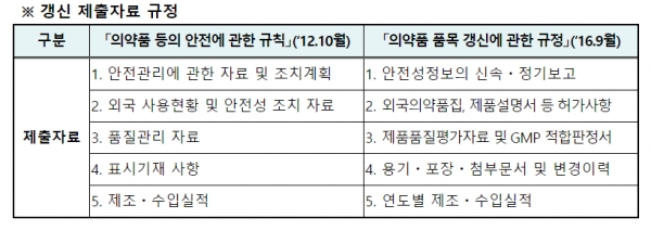 식약처는 지난 2017년 7월부터 '의약품 품목허가·신고 갱신제도'를 운영하고 있다. 의약품의 품목허가·신고 이후 안전성·유효성을 지속적으로 확보하고 효율적인 관리를 위해 5년마다 품목허가·신고를 갱신하고 있는 것이다.