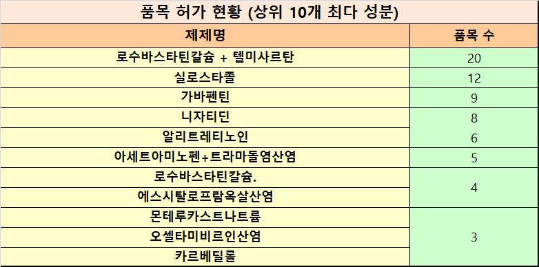 품목 허가 상위 10개 의약품 성분은 ▶ 로수바스타틴+텔미사르탄 (고혈압·고지혈증치료제/ 20품목) ▶ 실로스타졸 (항혈소판제/12품목) ▶ 가바펜틴 (뇌전증치료제/9품목) ▶ 니자티딘 (위산감소제/7품목) ▶ 알리트레티노인 (손습진치료제/6품목) ▶ 아세트아미노펜+트라마돌염산염 (소염진통제/5품목) ▶ 로수바스타틴칼슘 (고지혈증치료제/4품목) · 에스시탈로프람옥살산염 (우울증치료제/4품목) ▶ 몬테루카스트나트륨 (알레르기 비염치료제/3품목) · 오셀타미비르인산염 (독감치료제/3품목) · 카르베딜롤 (고혈압-협심증치료제/3품목) 이었다.