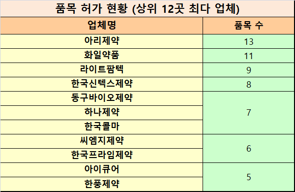 품목 허가 상위 업체 12곳은 ▶ 아리제약 (13품목) ▶ 화일약품 (11품목) ▶ 라이트팜텍 (9품목) ▶ 한국신텍스제약 (8품목) ▶ 동구바이오제약 · 하나제약 · 한국콜마 (각 7품목) ▶ 씨엠지제약 · 한국프라임제약 (각 6품목) ▶ 아이큐어 · 한풍제약 (각 5품목) 등으로 나타났다.