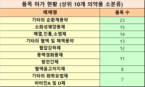 품목 허가 상위 10개 의약품 소분류는 ▶ 기타의 순환계용약 (23품목) ▶ 소화성궤양용제 (15품목) ▶ 해열, 진통, 소염제 (14품목) ▶ 기타의 혈액 및 체액용약 (13품목) ▶ 혈압강하제 (12품목) ▶ 동맥경화용제 · 항전간제 (각 11품목) ▶ 혈액응고저지제 (8품목) ▶ 기타의 화학요법제 · 비타민 A 및 D제 (각 7품목) 순이었다.