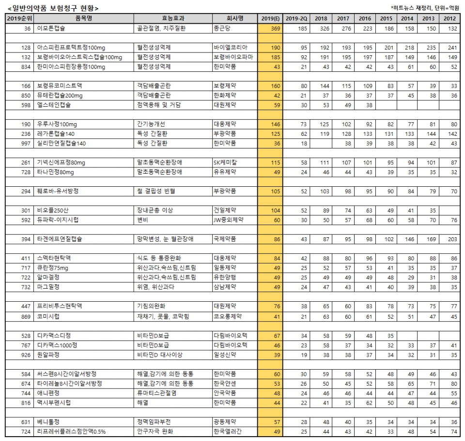 히트뉴스가 2019년 상반기 보험청구 일반의약품 현황을 집계한 결과 이모튼캡슐은 185억을 청구, 95억에 그친 아스피린프로텍트100mg(바이엘코리아)을 2배 가까이 앞질렀다.