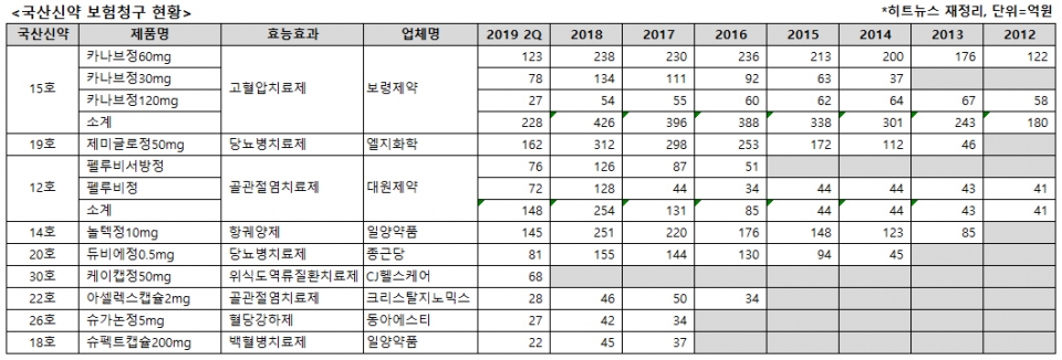 히트뉴스가 2012년부터 8년간 보험청구 상위 1000품목을 분석한 결과 국산신약은 품목별로 9종, 규격별로 12종이 포함됐다. 이번 분석에서는 개발된 국산신약을 토대로 추가 발매된 복합제와 같은 확장버전은 제외했고, 성장률의 경우 2019년 상반기 청구실적을 단순배수하고 이를 2012년 청구액과 비교하는 방식으로 계산했다.