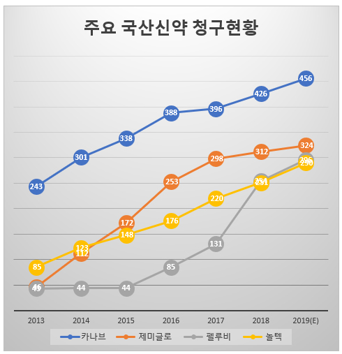 엘지화학의 당뇨병치료제 제미글로정의 성장률도 높았다. 제미글로는 2013년 46억을 청구한데 이어 2019년에는 162억을 달성할 것으로 예측됐다. 성장률은 604.9%에 달한다.