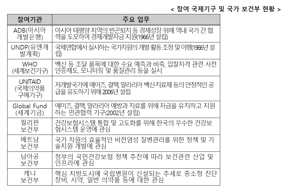 진흥원은 해외조달시장 수요분석, 정보제공, 공공조달 사업화, 기업 컨설팅 등을 지원하며 그 일환으로 전년도에 이어 개최하는 올해 행사에는 국제기구인 ADB, UNDP, UNITAID, WHO, Global Fund 및 필리핀, 베트남, 케냐, 남아프리카 공화국의 보건부 주요 인사들이 참여한다.