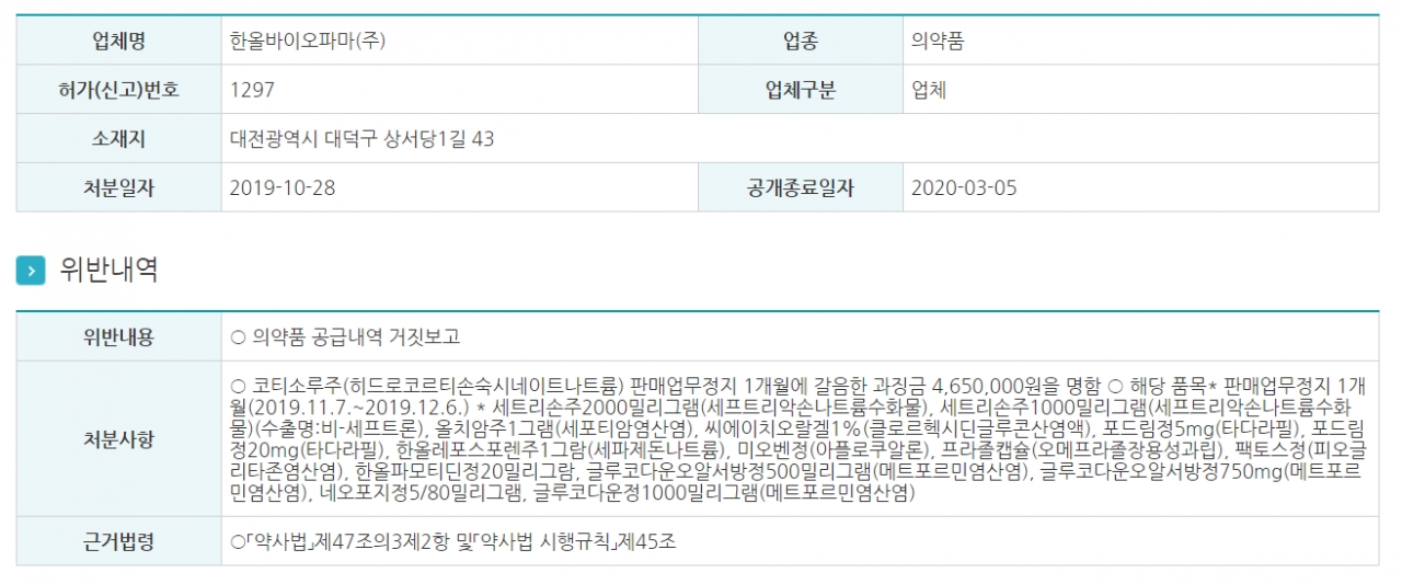 식품의약품안전처(처장 이의경, 이하 식약처)는 28일 한올바이오파마가 의약품 공급내역을 거짓보고했다는 이유로 이같은 행정처분을 내렸다고 공지했다.