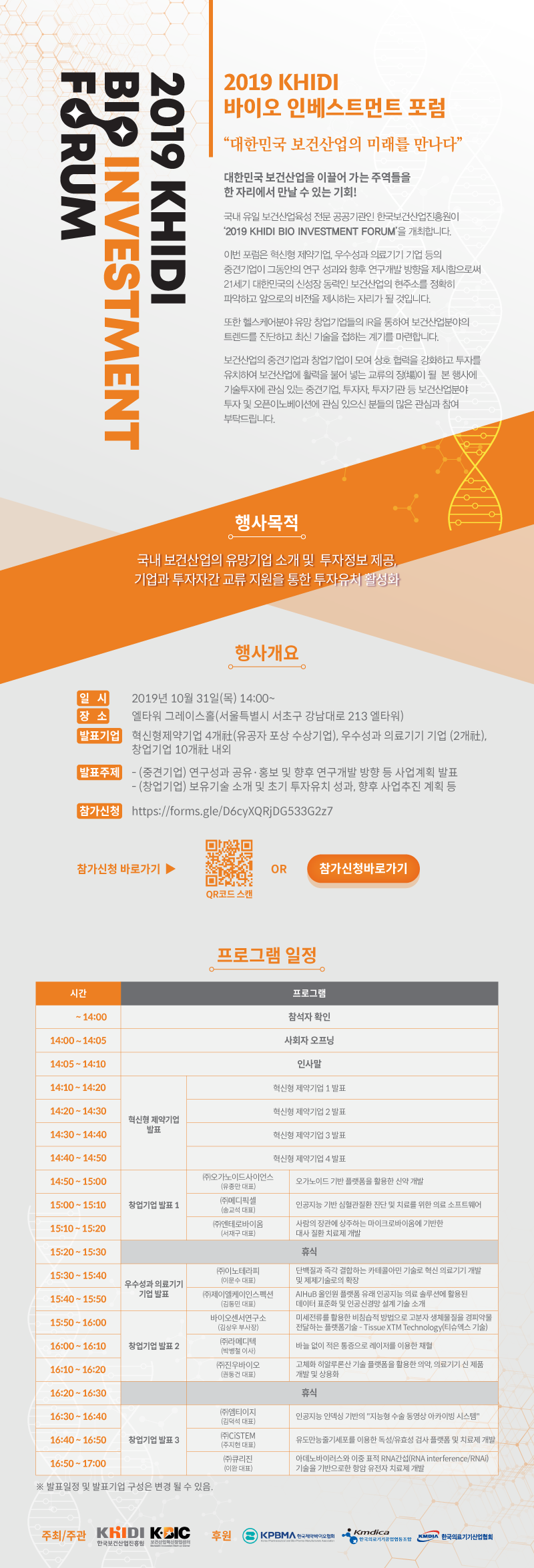 이 행사는 21세기 대한민국의 신성장 동력인 보건산업의 현주소를 파악하고 앞으로의 비전을 제시할 자리로, 국내외 중견기업, 투자자, 보건산업관계자등 투자 및 오픈이노베이션에 관심있는 관계자가 참여할 예정이다.