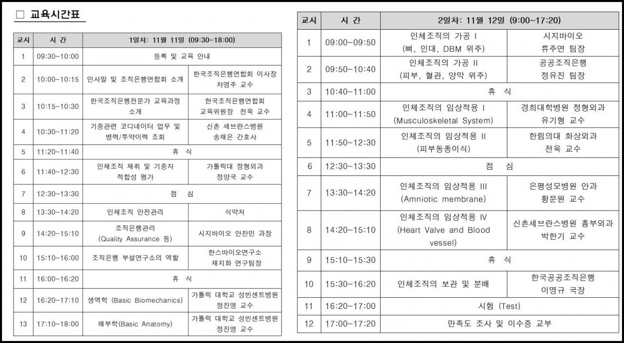 교육의 주요내용은 ▲인체조직 안전관리 ▲인체조직 채취 및 기증자 적합성 평가 ▲인체조직 가공절차 ▲인체조직의 임상적용 ▲인체조직 채취 및 적합성 평가 등으로 실무에 활용 가능한 과정을 추가해 현장에 도움이 되도록 구성했다.