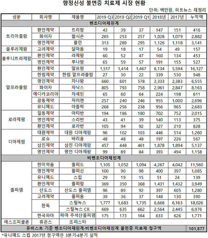 3일 히트뉴스는 2017년부터 2019년 3분기까지 향정신성 불면증 치료제 원외처방액을 유비스트 기준으로 비교 분석했다. 그 결과 벤조디아제핀계 시장은 환인제약의 알프람(알프라졸람)이 누적 161억원을 기록하며 가장 많은 실적을 냈다. 비벤조디아제핀계 시장은 한독의 스틸녹스(졸피뎀)가 누적 180억원으로 선두를 유지했다.