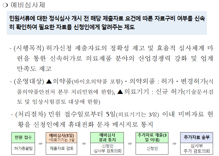 예비심사제는 민원서류에 대한 정식심사 개시 전 해당 제출자료 요건에 따른 자료구비 여부를 확인해 필요한 자료를 신청인에게 알려주는 제도다. 허가신청 제출자료의 정확성을 높이고 효율적 심사체계 마련을 통한 신속허가로 의료제품 분야의 산업경쟁력 강화 및 업계가 만족할 수 있게 한다는 취지다.