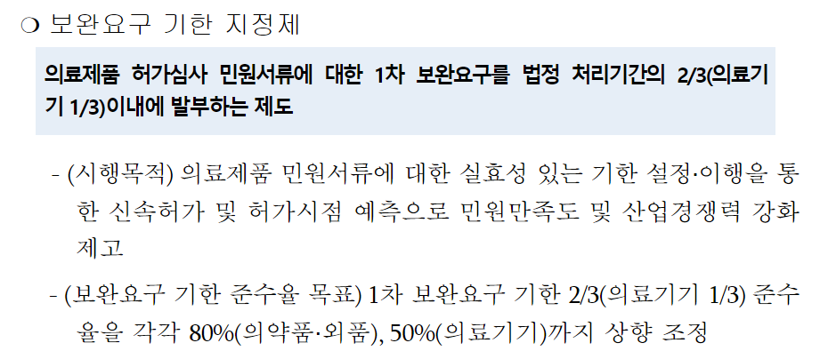 보완요구 기한 지정제는 의료제품 허가심사 민원서류에 대한 1차 보완요구를 법정 처리기간의 2/3(의료기기 1/3)이내에 발부한다. 의료제품 민원서류에 대한 실효성 있는 기한 설정?이행을 통한 신속허가 및 허가시점 예측으로 민원만족도 및 산업경쟁력을 강화하는 취지다. 보완요구 기한 준수는 1차 보완요구 기한 2/3 (의료기기 1/3) 준수율을 각각 80%(의약품?외품), 50%(의료기기)까지 상향 조정했다.
