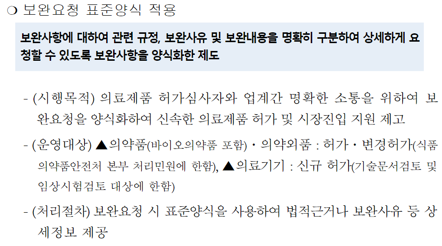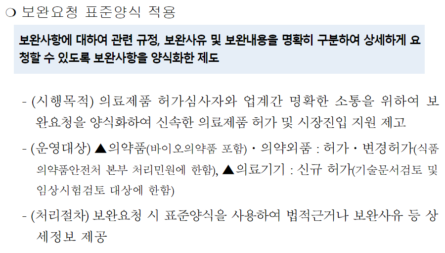 보완요청 표준양식 적용은 보완사항에 대해 관련 규정, 보완사유 및 보완내용을 명확히 구분, 요청할 수 있도록 보완사항을 양식화한 제도다. 의료제품 허가심사자와 업계간 소통을 위해 보완요청을 양식화했고 신속한 의료제품 허가 및 시장진입 지원을 돕는다.