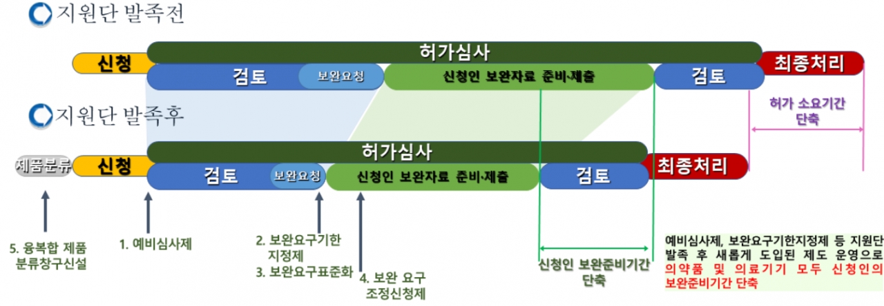 지원단은 발족 후 신설한 신청인 중심 허가제도로 ▶ 예비심사제 ▶ 보완요구 기한 지정제 ▶ 보완요청 표준양식 적용 ▶ 보완요구 조정신청절차 (혁신제품조정위원회)를 마련했다.