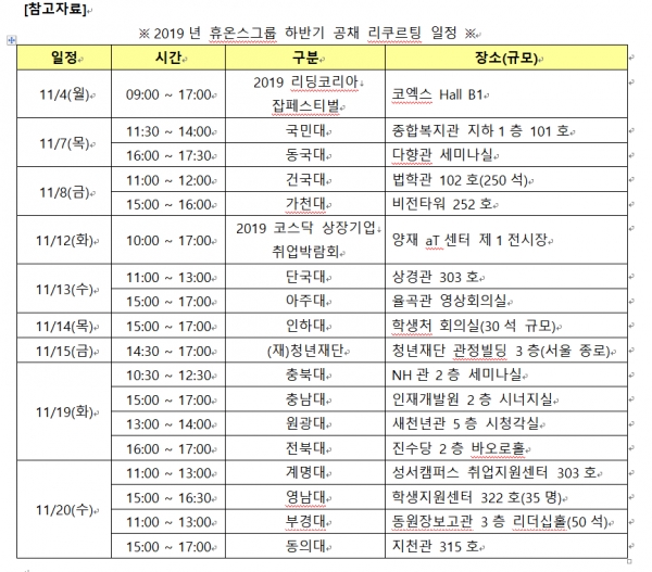 휴온스그룹은 이번 채용을 위해 지난 4일 '2019 리딩코리아 잡페스티벌'을 시작으로, 수도권 및 지역 주요 대학과 채용 박람회에서 총 18회의 채용설명회를 진행한다.