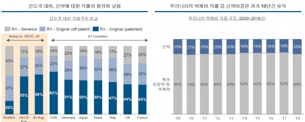 "OECD와 A7국가는 약품비에서 신약이 차지하는 비중(평균)이 각각 55%, 58%다. 그런데 한국은 20%로 큰 차이를 보이고 있다. (국내 많은 제도변화에도 불구하고) 2009년부터 2018년까지 이런 경향은 변함없이 계속 이어져 왔다."