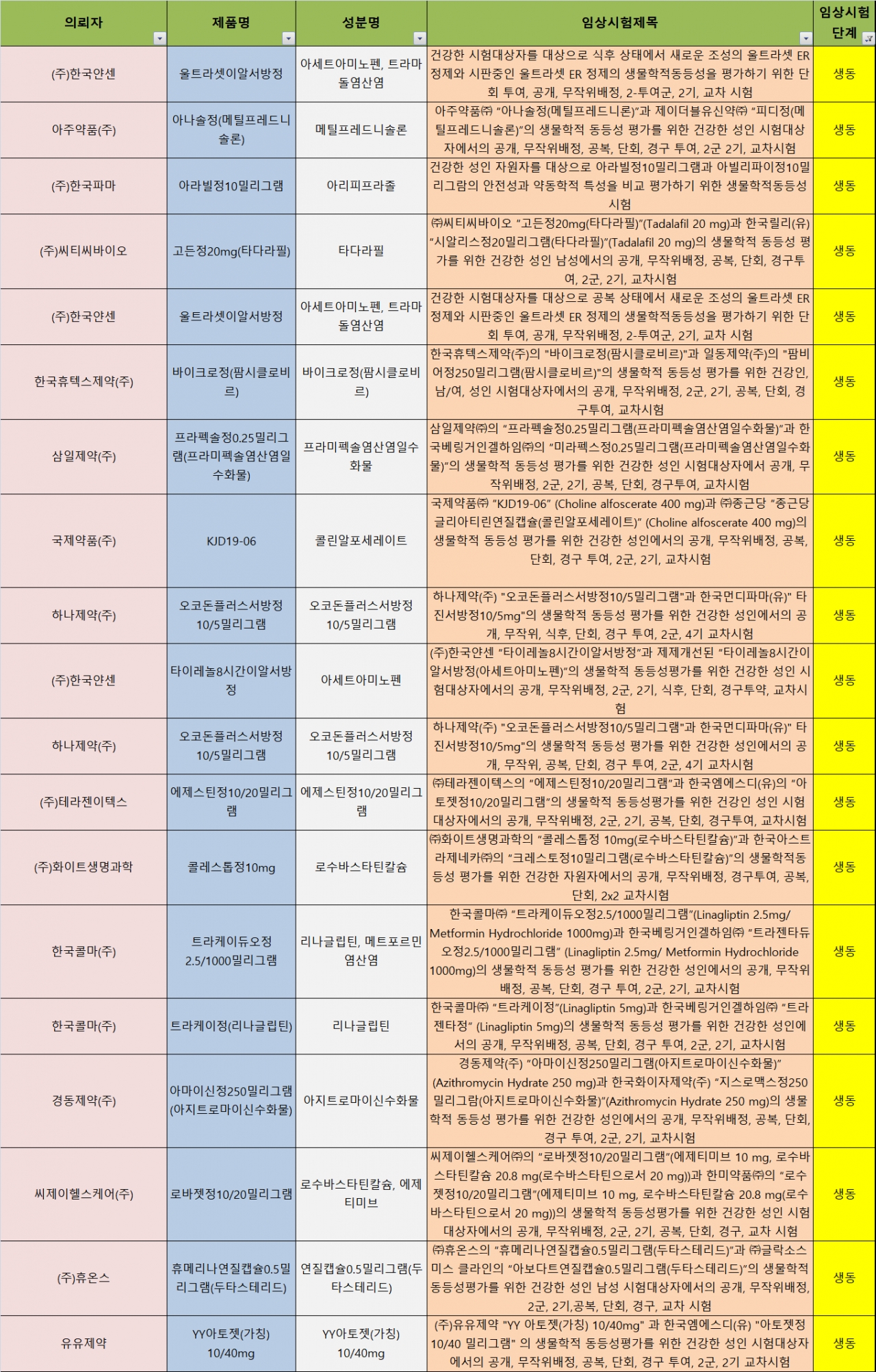신청인(중복 포함)별로는 제약바이오기업 32건, CRO 5건, 의료기관 3건 등이었다. 제약바이오기업의 경우 국내사 24건, 다국적사 8건이었다. 시험단계별로는 ▶ 생동성 시험 19건 ▶ 3상 6건 ▶ 1상 4건 ▶ 2상 · 연구자 임상시험 각 3건 ▶ 2a상 2건 ▶ 1b상 · 2/3상 각 1건 순으로 많았다.