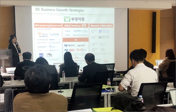 부광약품은 지난 7일 KB증권본사에서 ‘오픈 이노베이션 전략 및 성과 발표회’를 개최했다. 유희원 대표이사 사장이 부광약품의 비즈니스 전략을 한눈에 볼 수 있는 프레젠테이션 자료를 설명하고 있다.