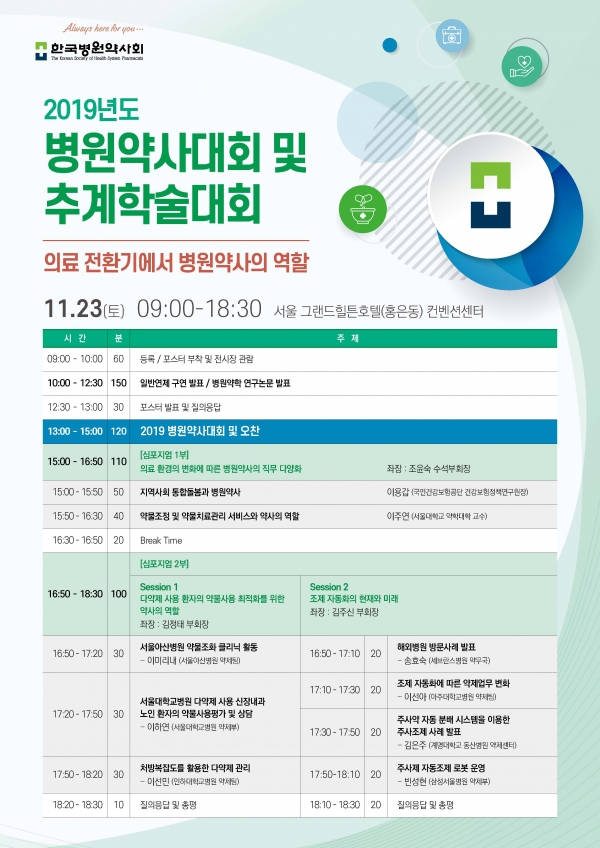한국병원약사회(회장 이은숙)는 오는 23일 서울 그랜드힐튼호텔 컨벤션센터에서 '의료 전환기에서 병원약사의 역할'을 주제로 '2019년도 병원약사대회 및 추계학술대회'를 개최한다고 밝혔다.