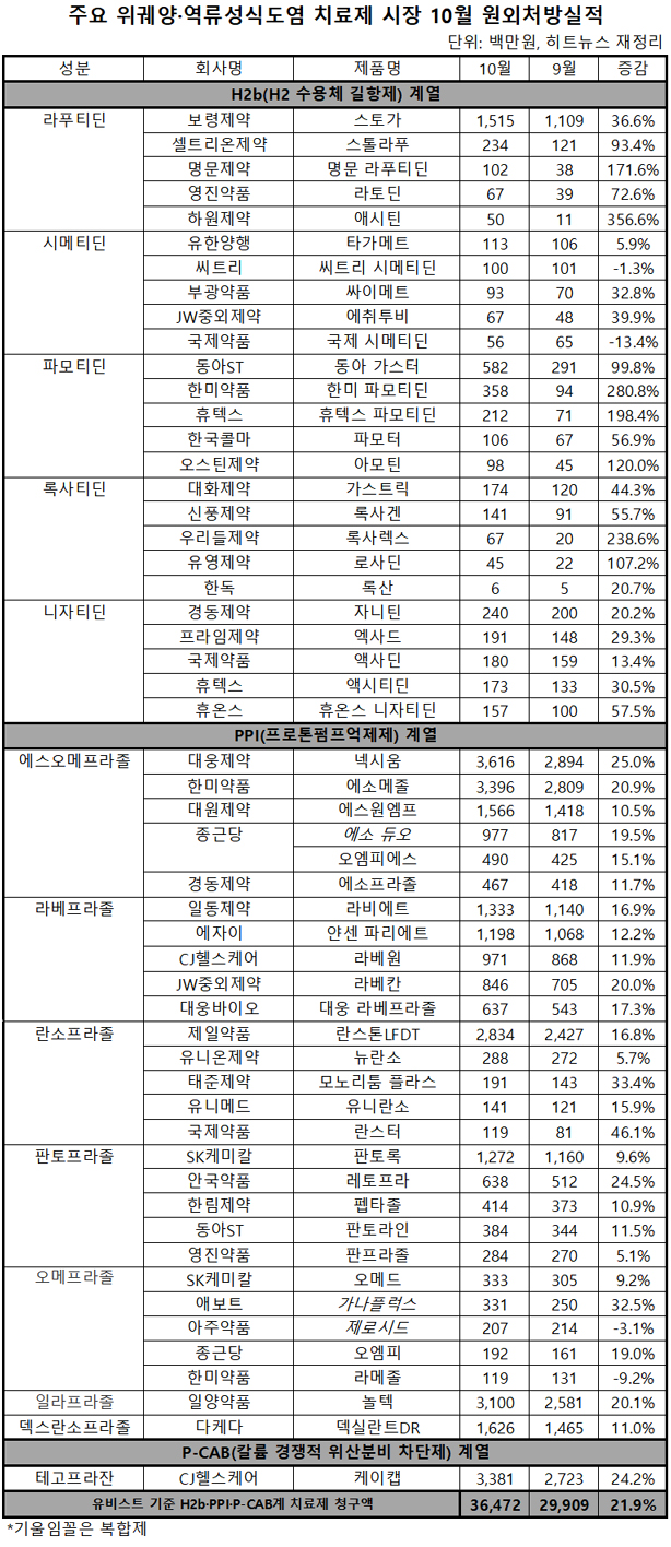 17일 히트뉴스는 주요 위궤양 치료제의 9·10월 원외처방액을 유비스트 기준으로 비교 분석했다. 그 결과 H2b 계열은 1개월 사이 파모티딘 139%·록사티딘 68%·라푸티딘 49% 순으로 상승했고, PPI는 10%대로 고르게 성장했다. P-CAB 계열 국산신약인 케이캡(테고프라잔)은 24.2% 늘어 34억원을 기록했다.