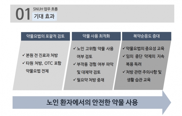 진료 전 환자의 약력을 파악하며 현재 사용 약물을 평가했다. 구체적으로 ▶ 전체 약물 개수와 노인 고위험 약물 개수 ▶ 투여기간, 약물/약품선택, 용량/용법, 중복 등 처방 정확성과 적절성 ▶ 처방변경 내용, 이전 처방용법, 처방변경사유 진료기록 등 조회 ▶ 지속 필요성 또는 중단가능 여부 ▶ 약물-약물, 약물-질병 상호작용 ▶ 모니터링 지표 확인을 했다.