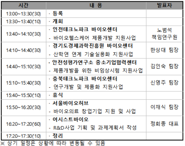 프로그램은 △바이오헬스케어 제품개발 지원사업(노범석 인천테크노파크 바이오센터 책임연구원) 발표를 시작으로 △산학연 연계 기술실용화 지원사업(한상대 경기도경제과학진흥원 바이오센터 팀장) △제품개발을 위한 비임상시험 지원사업(김인숙 안전성평가연구소 중소기업협력센터 팀장) △연구개발 및 제품화 지원사업(신영주 충북테크노파크 바이오센터 팀장) △바이오의료 창업기업 지원 및 사업(이재식 서울바이오허브 팀장) △R&D사업 기획 및 과제계획서 작성(정회종 어시스트바이오 대표) 순으로 진행될 예정이다.