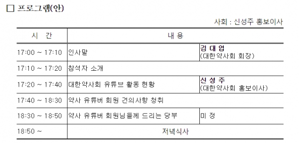 이번 간담회를 주관한 신성주 홍보이사는 "유튜버 활동을 통해 약사직능과 대중 간 소통 저변 확대에 기여해 주신 회원님들을 격려하고 감사를 전하는 자리가 될 것"이라며 "열심히 활동하고 있지만 정확한 정보 파악이 어려워 참석 요청을 드리지 못한 약사 유튜버님들이 다수 있어서 아쉬웠다. 다음 기회에 더 많은 회원님을 모실 수 있도록 노력하겠다"고 했다.