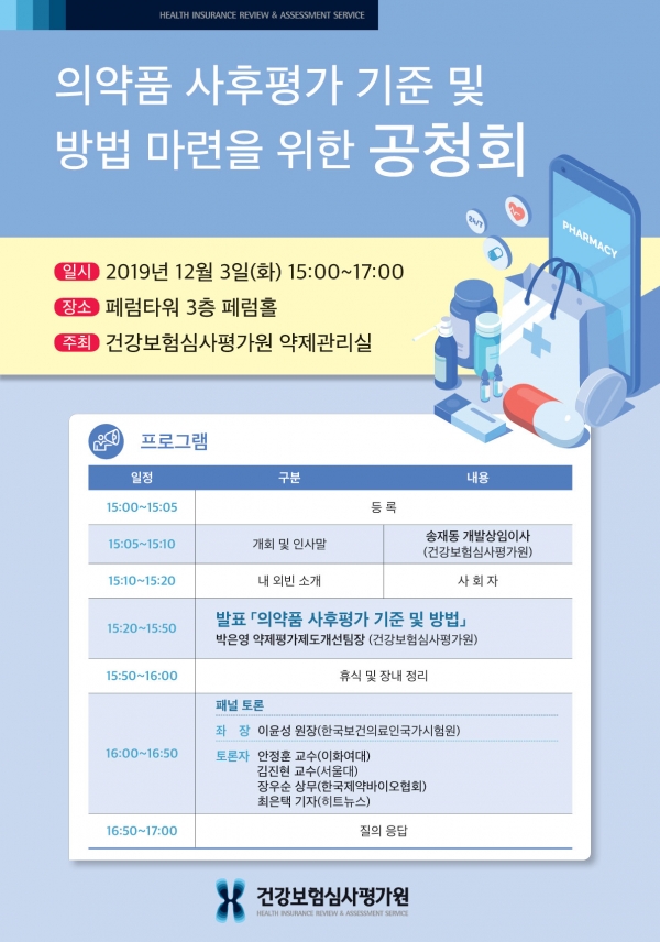 건강보험심사평가원 약제관리실이 오는 3일 오후 3시 페럼타워 3층 페럼홀에서 '의약품 사후평가 기준 및 방법 마련을 위한 공청회'를 개최한다.