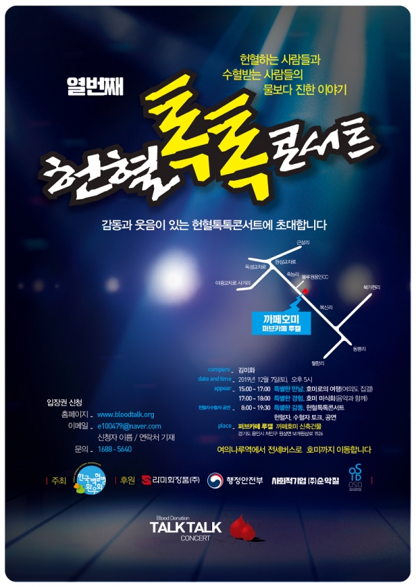 백혈병환우회(대표 안기종)는 '헌혈하는 사람들과 수혈받은 사람들의 물보다 진한 이야기'를 주제로 오는 7일 오후 5시부터 7시30분까지 경기 용인소재 '퍼브카페루캘'에서 '2019년 헌혈톡톡콘서트(https://youtu.be/OITqSzW-Zsg)'를 갖는다.