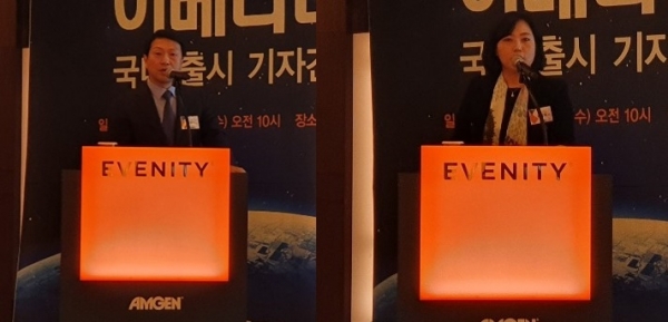 심상희 안젠코리 골격계사업부 전무는 4일 웨스틴조선호텔에서 열린 이베니티 국내 출시 기자간담회에서 “프롤리아는 RANKL에 선택적으로 결합하는 약제로 주로 파골세포 분화에 관여해 파골세포 활성화를 떨어뜨려 골흡수 억제에 도움을 주는 약물이고, 이베니티는 조골세포 골형성 촉진과 파골세포 억제를 동시에 타깃하는 약제로 전 세계 최초로 이중 형성 기전을 가져 초고위험군 환자에게 쓰일 수 있다”고 했다.