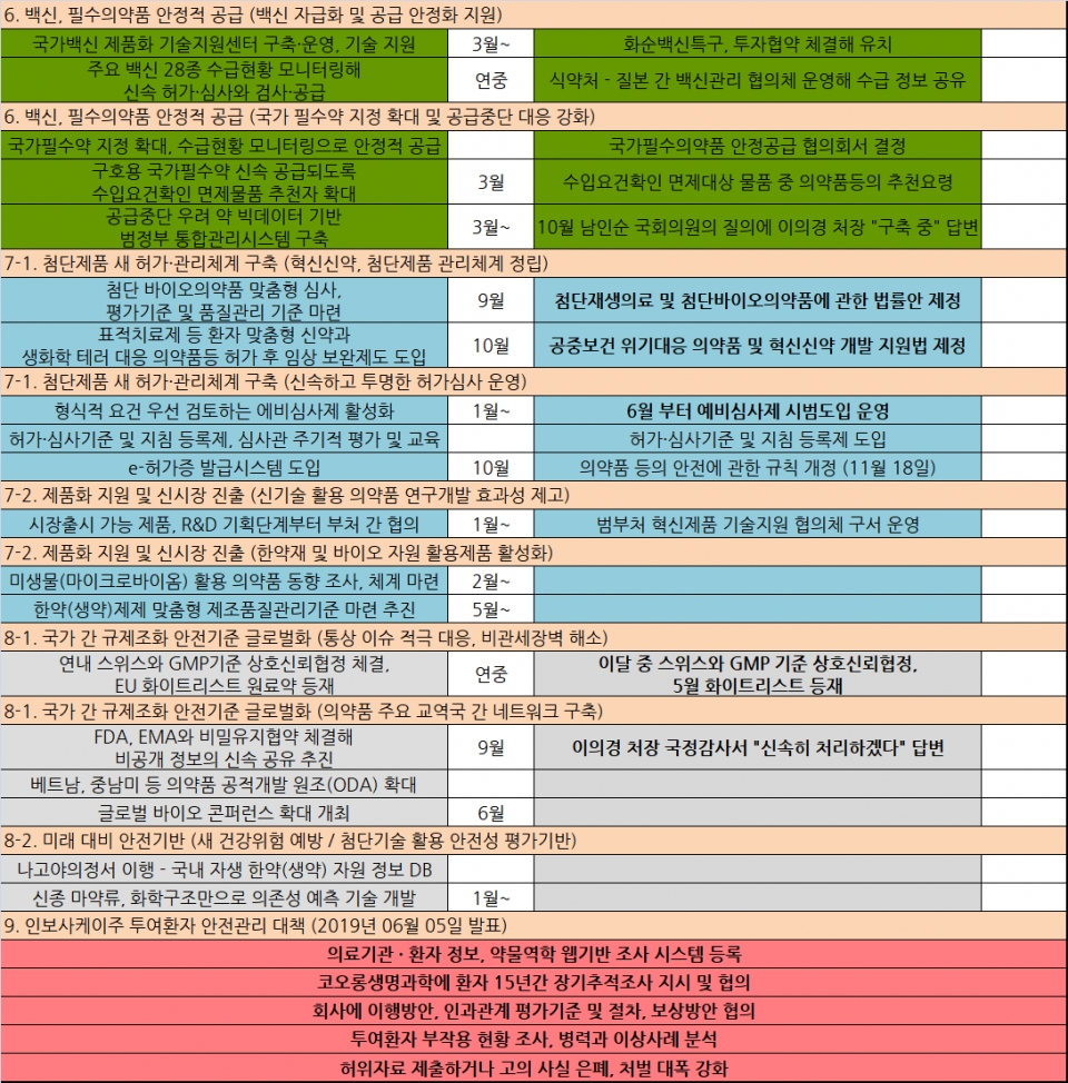 한편, 역시 국정감사에서 미진하다는 지적을 받았던 '인보사 환자안전관리'는 장기추적조사를 시작해 "열심히 하고 있다"는 게 식약처의 설명이다. 이의경 식약처장은 국정감사장에서 "국민건강보험공단에서 환자 2명의 검사를 개시했다"고 했었다.